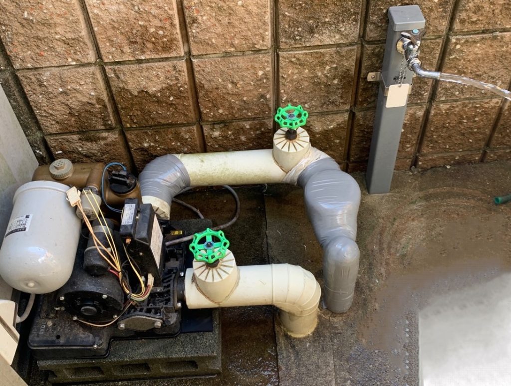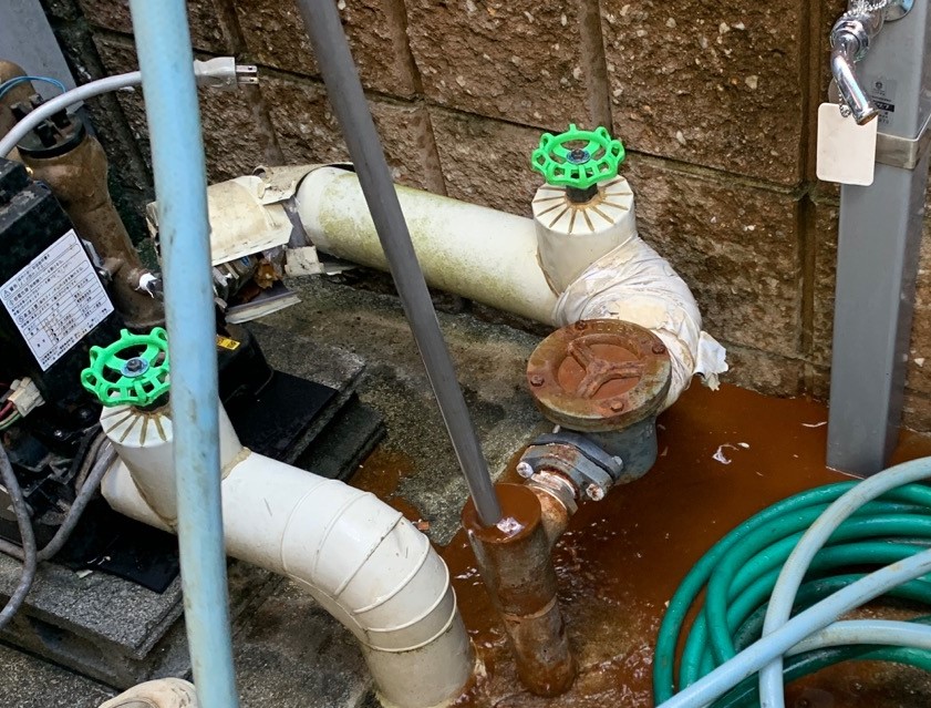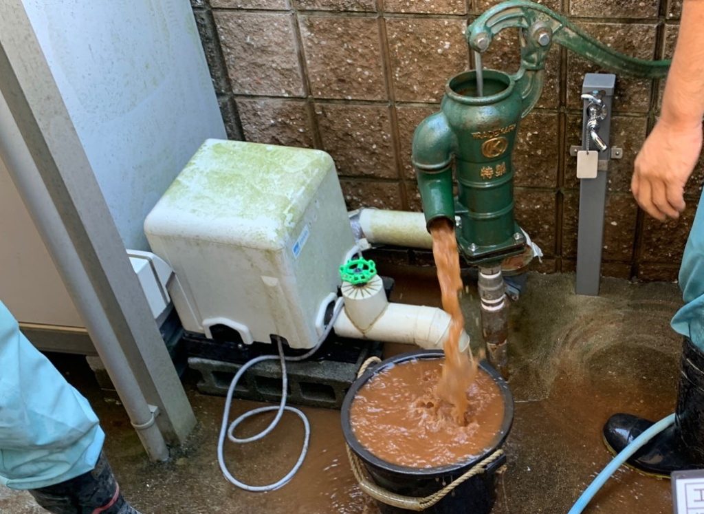 井戸のパイプに13φのパイプを継ぎ足して入れて、水道水で攪拌し、パイプの穴が塞がっているので溢れてきました。パイプ内部の不純物を除去してから、手押しポンプで水を掻き出し、穴の錆などを取り除く作業をしました。すると汲み上げた水に、地層の砂が混じり、井戸パイプの塞がっていた穴が開いたという事になります。その後、強力な電動ポンプにて水が澄むまで汲み上げて、作業が完了し、井戸が復活しました。