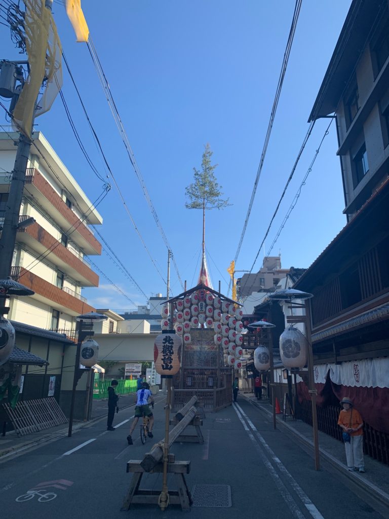 今日は祇園祭の後祭りでした。山、鉾の数が半分ぐらいになり、賑やかさと華やかさは前祭りより控えめですが、それぞれ町内の方の想いは伝わってきます。長い柱のような棒の説明も町内の方から教えてもらいました。みんなお祭り好きです。