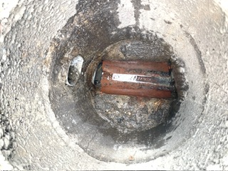 配管の不具合は見過ごす訳にはいきません。ジャッキアップをし、パイプの底にスペーサーをかましてモルタルを入れ沈下しないようにし、補強でパイプと半管の隙間には水中ボンドを塗布し、桝の壁面の穴の開いてる部分はモルタルを充填して、長寿命化を施しました。