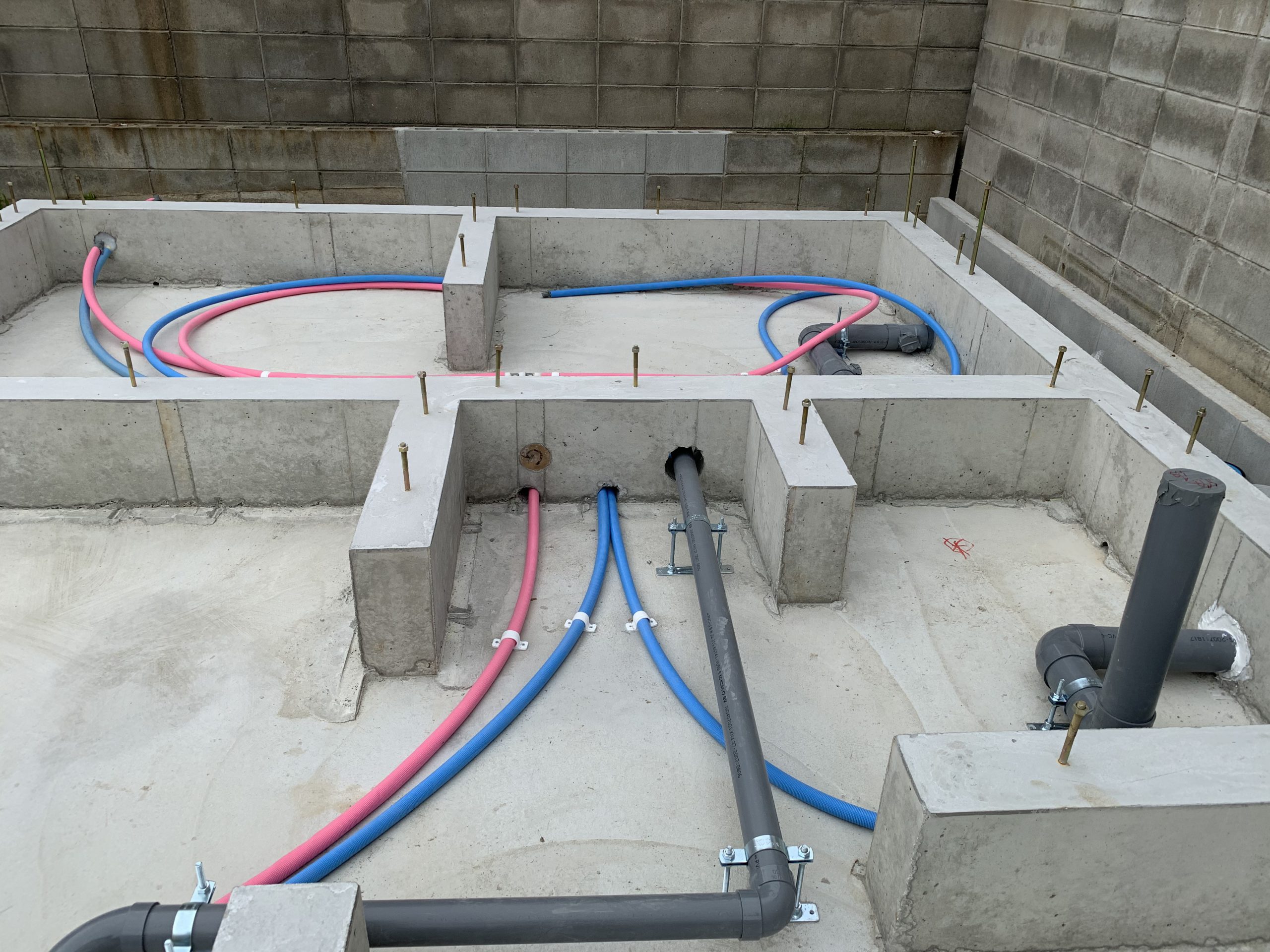 かめジョンが行く!シリーズ!今回は新築工事。前回のボイド入から1カ月!埋設と同時に床下配管の施工です。いつもお世話になっている名神通商さんによって材料を調達して現場に到着!同じく直射日光をまともに浴びながらの施工です。担当はボイド入れに続きMさん。給水管は私が想像していたものとずいぶん違っていました。給水配管、ホースみたいです。ピンク色が温水・水色が水、わかりやすいですね。グレー、の配管が排水です。職業がらでしょうか・・・こうやって仕上がりを見ると美しいですね。